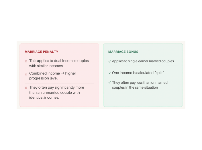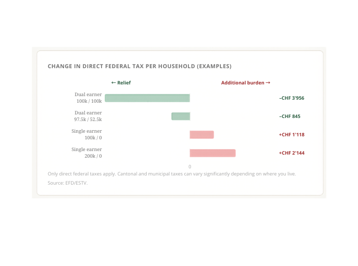 Until now, Switzerland taxed married couples jointly. It sounds simple—but there’s a major drawback: when two incomes are combined, you quickly move into a higher tax bracket. Taxes increase disproportionately.
