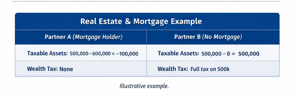 - Partner A: negative net wealth → no wealth tax