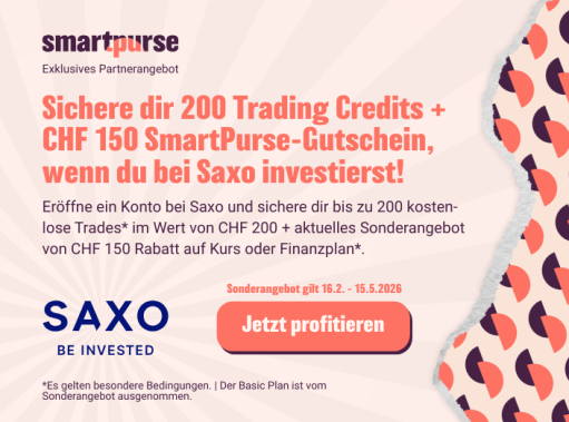Investieren Sie mit Saxo und erhalten Sie Handelskredite im Wert von 200 CHF. Sonderbonus: Vom 16. Februar bis zum 15. Mai 2026 erhalten Sie einen zusätzlichen SmartPurse-Gutschein im Wert von 150 CHF für einen Finanzplan* oder Kurs, wenn Sie ein Konto bei Saxo eröffnen und Ihre erste Investition tätigen.